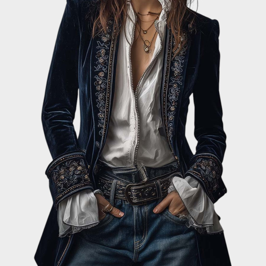 La chaqueta Sara aporta una elegancia serena a tu vestuario con su tacto aterciopelado y sus delicados detalles bordados.